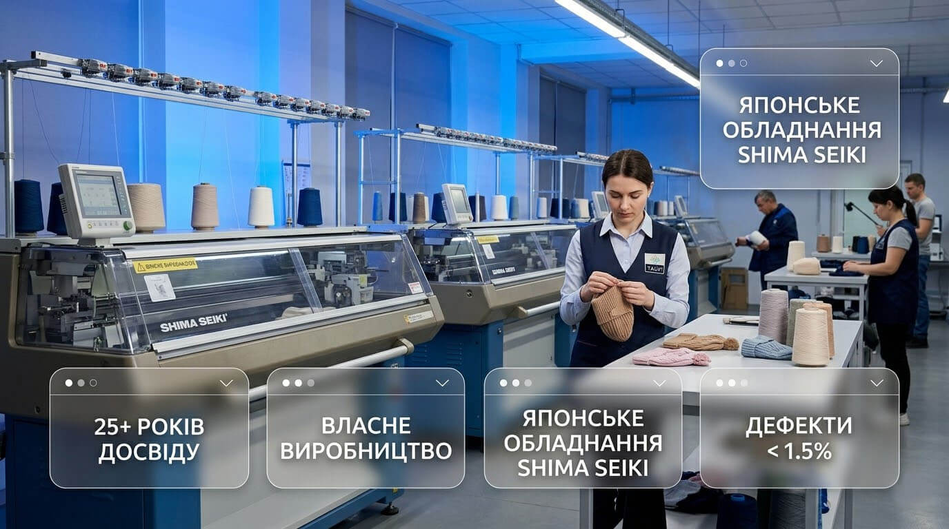 Talvi Ukraine функціонує як повноцінний виробник із понад 25-річним досвідом, використовуючи промислові в’язальні машини японського бренду SHIMA SEIKI. Таке обладнання забезпечує точність в’язання до 0,1 мм і дозволяє зменшити кількість виробничих дефектів до рівня менше ніж 1,5%, що відповідає стандартам ISO у текстильній галузі.