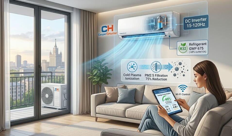 Ключевая технологическая особенность кондиционеров Cooper&Hunter заключается в использовании DC-инверторных компрессоров последнего поколения с частотным диапазоном работы от 15 до 120 Гц, что позволяет снижать энергопотребление до 40% по сравнению с классическими on/off системами. В ряде моделей применяется хладагент R32 с коэффициентом глобального потепления (GWP) около 675, что почти в три раза ниже, чем у устаревшего R410A. Согласно аналитике International Energy Agency, переход на такие хладагенты является ключевым трендом отрасли до 2030 года.