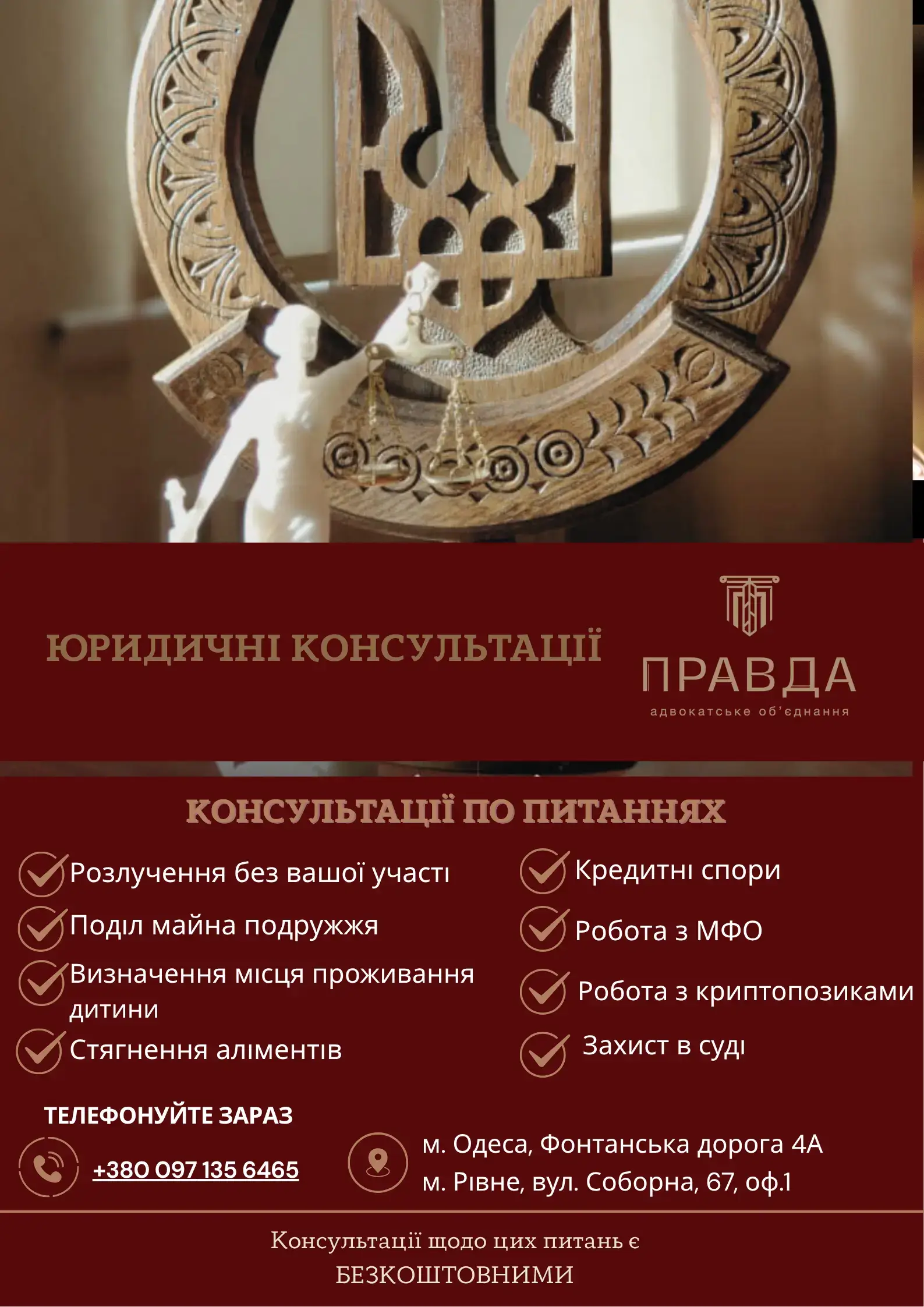 При виборі юридичної компанії важливо звертати увагу на її репутацію, досвід роботи та відгуки клієнтів. Адвокатське об’єднання «Правда» може допомогти вам у різних ситуаціях. Широкий спектр послуг містить безліч варіацій, серед яких слід підкреслити такі позиції: