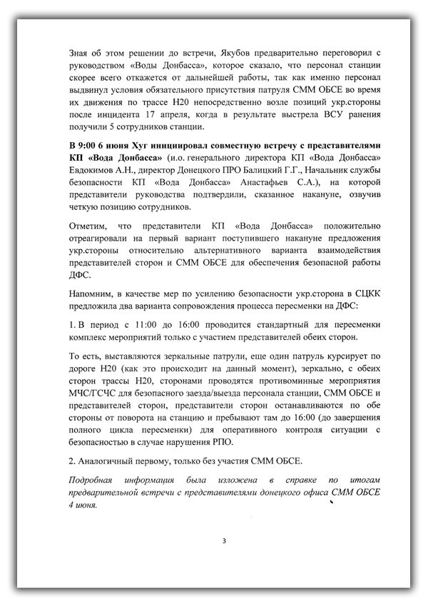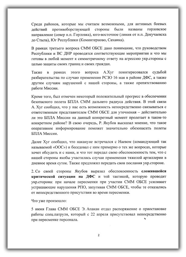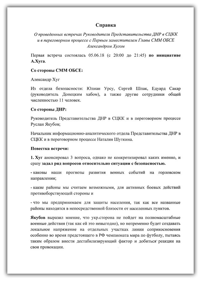 Естественно, обо всех своих разговорах, официальных и неофициальных встречах с сотрудниками ОБСЕ, обо всех успехах в своей кампании по дезинформированию международных наблюдателей, Руслан Вахитов регулярно докладывает в российский Генштаб. Один из таких докладов про результаты встречи Вахитова с Хугом в июне 2018 года оказался в нашем распоряжении.