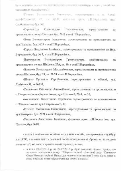 В заявлении в полицию Кодебский указывает, что именно “Борщаговська Сич” по составу участников полностью совпадает с преступной группировкой, терроризирующей ныне пригороды Киева.
