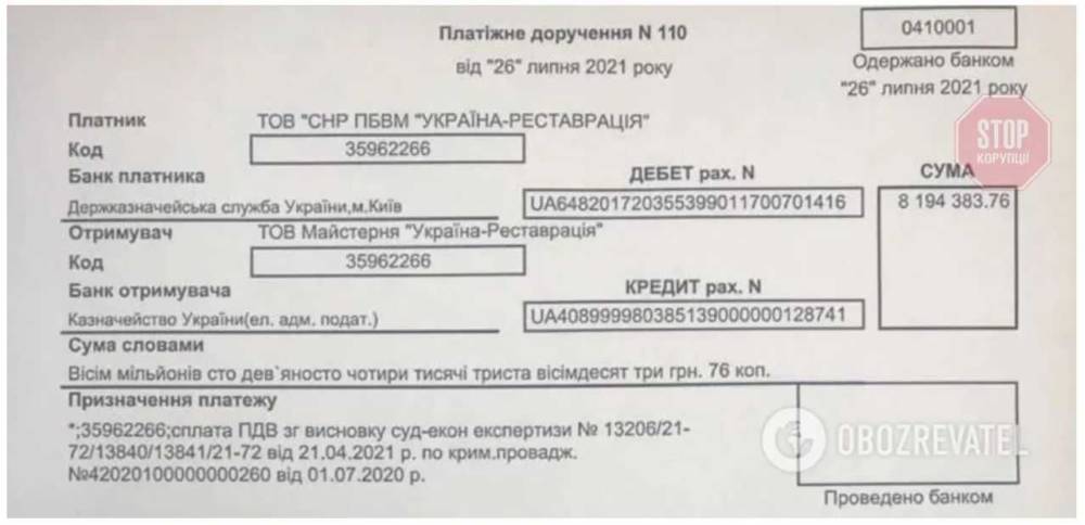 Ще одна компанія, яка скористалася тією ж схемою – «Майстерня Україна-реставрація»: підприємство переказало 8,1 млн грн нібито для компенсації несплачених податків, однак насправді одержувачем вказало себе ж.