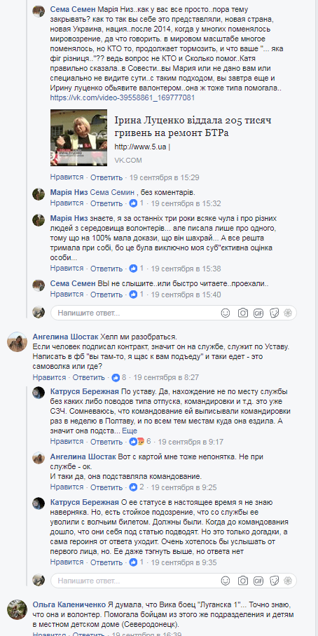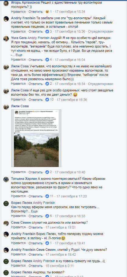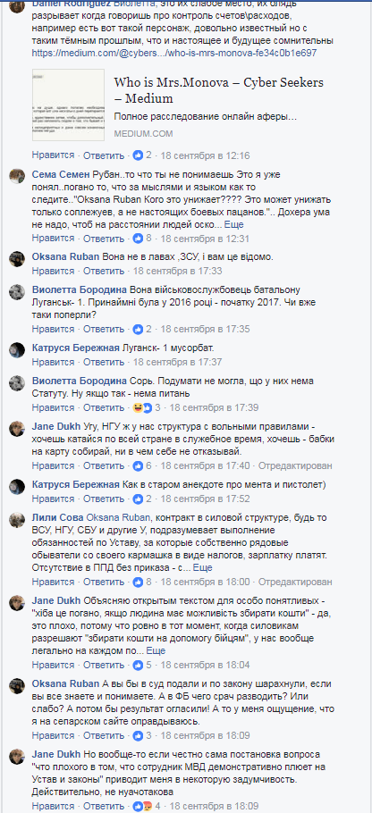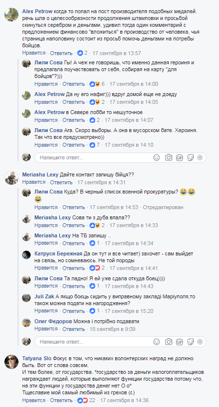 Алиса Лисичка, Лили Сова, та Катруся Бережная видають себе начебто як волонтери, можливо відсутність фінансових та майнових звітів у їхніх хроніках підштовхнуло їх на бруд? Бо на відміну від них у Вікторії Мірошніченко та інших порядних волонтерів є публічні звіти про отримані кошти, від кого, та на що витрачені…