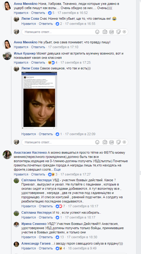 P.S. Додам ще, що ні УБД , ні контракту в мене немає. І не буде. Бойових нагород також не маю. Як що розповсюджуєте плітки, то хоч не пишіть того з чого освідченні люди ржатимуть.”